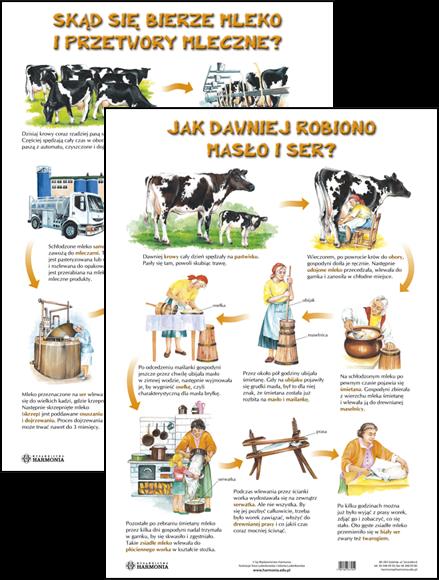 JAK DAWNIEJ ROBIONO MASŁO I SERY? / SKĄD SIĘ BIERZE MLEKO I PRZETWORY MLECZNE?♦ format 61 cm x 86 cm♦ dwustronnie zalaminowane♦ wieloletnia trwałośćW jaki sposób mleko trafia na nasze stoły? Każde dziecko wie, że mleko daje krowa. Ale co dzieje się z tym smacznym napojem, zanim w kartonach pojawi się w sklepie?Plansza na jednej stronie prezentuje współczesny proces przetwórstwa mlecznego. Od dojenia za pomocą dojarek elektrycznych przez transport, obróbkę do powstania gotowego produktu: mleka, sera, jogurtu, maślanki, masła.Druga strona planszy prezentuje, jak przetwórstwo mleczne wyglądało dawniej. Dzieci dowiedzą się z niej, jak wyglądały tradycyjne metody robienia masła i sera: ubijanie w maselnicy, wyciskanie w prasie.Planszę można wykorzystać na każdym etapie nauki: zarówno w przedszkolu, klasach 1-3, jak i na lekcjach historii czy przyrody.