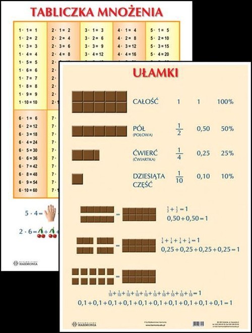 UŁAMKI / TABLICZKA MNOŻENIA♦ format 61 cm x 86 cm♦ dwustronnie zalaminowane♦ wieloletnia trwałośćPrezentujemy Państwu plansze edukacyjne dla przedszkoli i klas 1-3. Jest to zestaw pomocy dydaktycznych, które przydadzą się w każdej klasie i sali przedszkolnej.Tematyka plansz jest zgodna z programem nauczania i dotyczy rzeczy bliskich dziecku. Dzięki wyrazistym ilustracjom i zdjęciom tablice w przyjazny sposób przedstawiają realia naszego świata. Poszczególne wzory sprawdzą się w dekorowaniu klasy lub pokoju dziecka, zwłaszcza jeśli ma już ono swoje zainteresowania.Planszę tę przeznaczono dla dzieci starszych, które uczą się tabliczki mnożenia i poznają ułamki. Przedstawia ona w jasny i czytelny sposób oba elementy matematyki, korzystając z konkretów - kostki czekolady, wiśni i ilości palców.