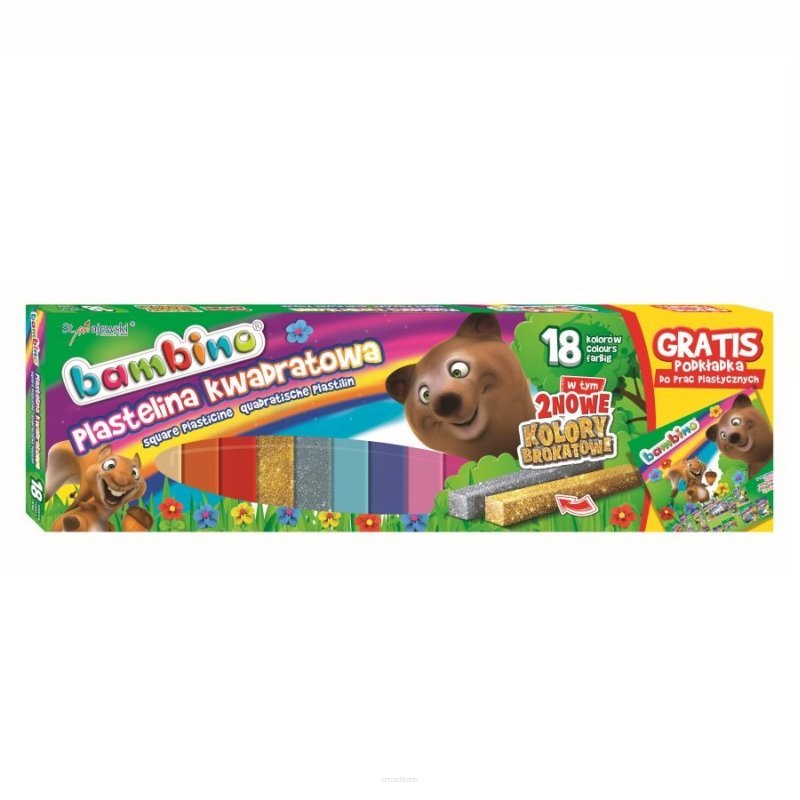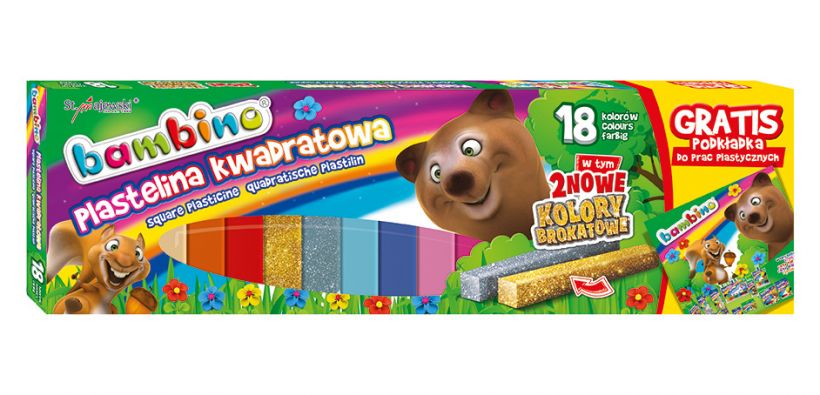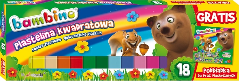 Plastelina Bambino to wysokiej jakości masa plastyczna. Jest elastyczna, nie brudzi rąk, nie przywiera do podłoża, łatwo się modeluje, pozwala na tworzenie prac metodą millefiori. Nie wysycha na powietrzu, przez co może być wykorzystywana wielokrotnie. Gama kolorów jest szeroka, barwy żywe, nasycone. Plastelina jest bezpieczna, ponieważ produkowane jest w zgodności z dyrektywą Parlamentu Europejskiego i Rady w sprawie bezpieczeństwa zabawek oraz rozporządzeniem Ministerstwa Gospodarki w sprawie zasadniczych wymagań dla zabawek. Licencja - BAMBINO Ilość kolorów - 18