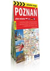 format: 98 x 68 cm, po złożeniu 12 x 23 cm?dwustronnie foliowany, trwały plan Poznania?szczegółowy rysunek zabudowy wraz z numeracją budynków wzdłuż ulic i na osiedlach?linie autobusowe i tramwajowe wraz z przystankami?sygnalizacja świetlna, ulice jednokierunkowe, parkingi?bogata treść turystyczna, m.in.: zabytki, muzea, hotele i inne istotne obiekty?budynki użyteczności publicznej, centra handlowe?szczegółowy plan centrum w skali 1:10 000 (1 cm ? 100 m)?plan Międzynarodowych Targów Poznańskich?schemat nocnych linii autobusowych?informator teleadresowy?skorowidz ulic