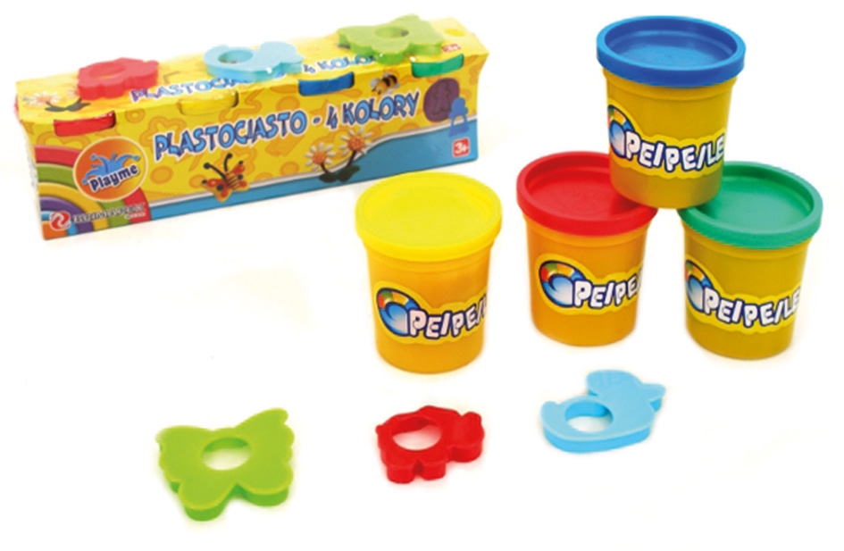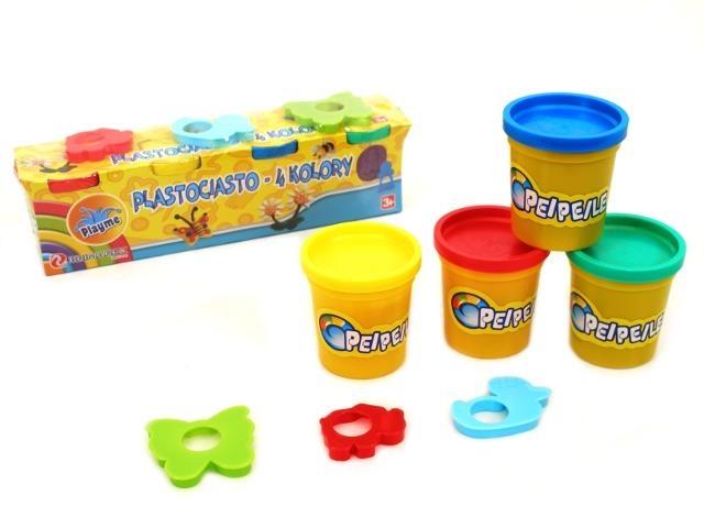 4 pojemniki z plastociastem - w kolorach: zielony, niebieski, żółty, czerwony.