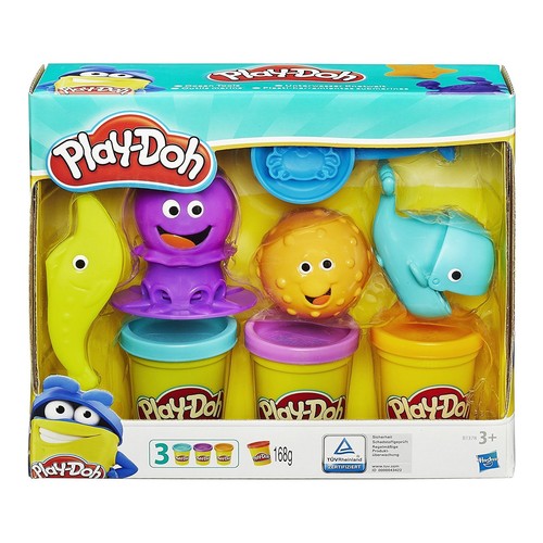Zestaw Play-Doh zawiera 3 pudełka masy plastycznej oraz akcesoria i foremki do zabawy w tworzenie morskich zwierząt.