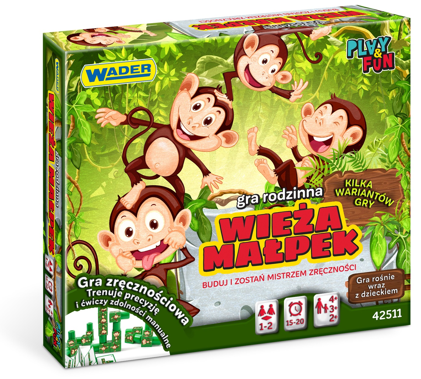 GraMY? Oczywiście, że tak! Ta zręcznościowa gra sprawi, że w Waszym domu będzie słychać wybuchy śmiechu. Małpia wieża spodoba się najmłodszym dzieciom (2+), trochę starszemu rodzeństwu, mamie, tacie oraz babci i dziadkowi, bo w każdym wieku powinno się trenować mózg i zmysł równowagi.