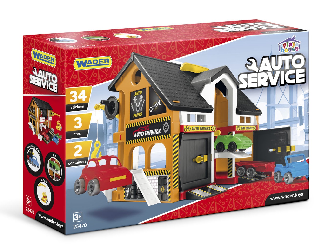 Play House Auto Serwis jest dwupiętrowym domkiem z wieloma ruchomymi elementami takimi jak otwierane drzwi, winda, dźwig. W zestawie znajdują się również trzy samochody, podjazdy oraz zestaw 34 naklejek do samodzielnego przyklejenia.