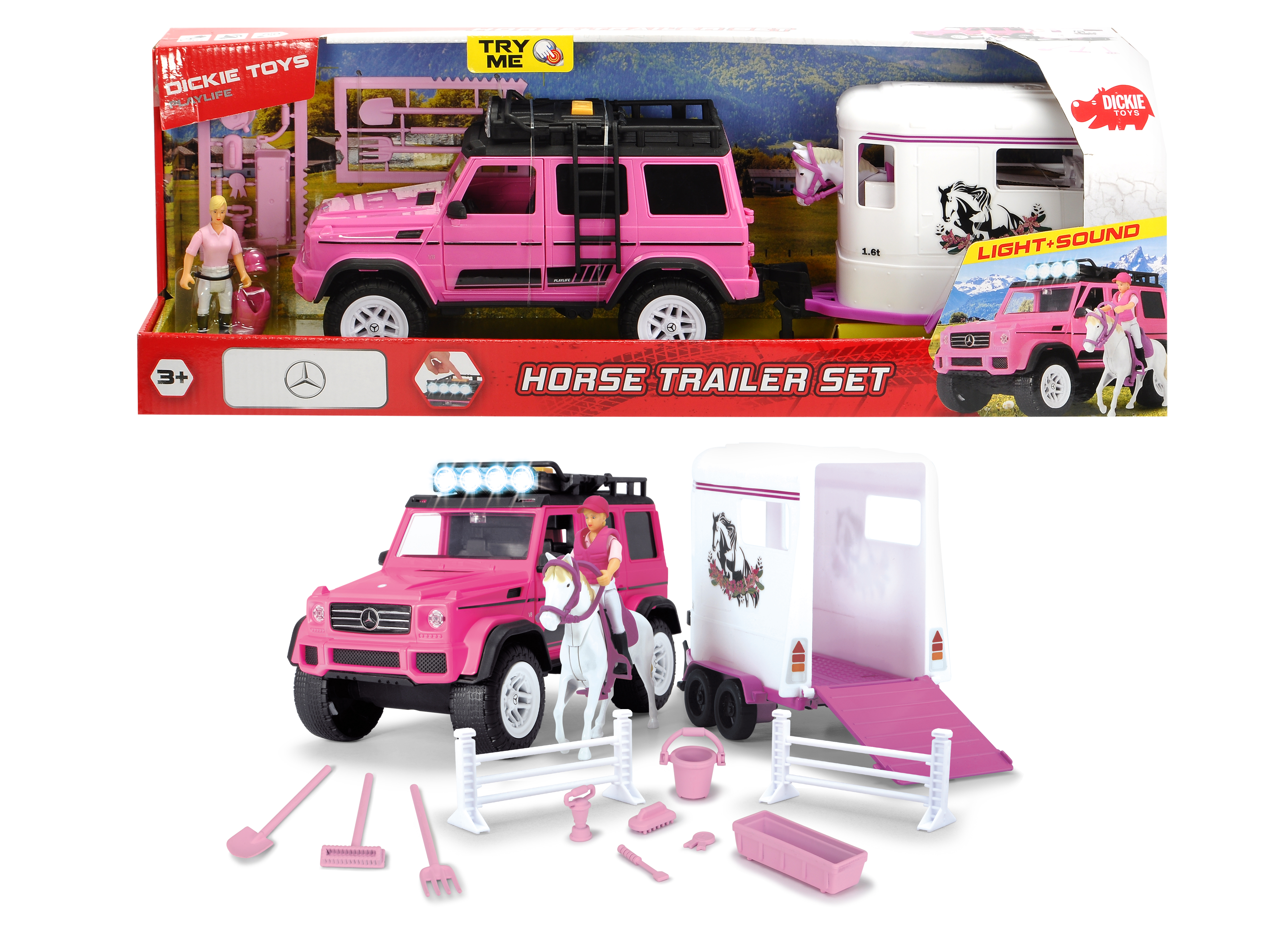 Mercedes-Benz G 500 44, przyczepa dla koni, figurka i wiele wspaniałych akcesoriów, to wszystko zapewnia wiele frajdy. Moduł oświetleniowy i dźwiękowy na dachu samochodu. Za naciśnięciem przycisku odtwarzane są odgłosy przyrody i silnika. Pojazd terenowy i przyczepa konna mają wiele ruchomych części i mierzą 40 cm. Drzwi samochodu mogą być otwierane. Dzięki szczegółowym akcesoriom, takim jak przeszkody do skakania, kask, akcesoria stajenne i konne, można się doskonale bawić. Zestaw Playlife Horse Trailer Set w skali 1:24 jest odpowiedni dla dzieci od trzeciego roku życia, a dzięki dołączonym bateriom, dzieci mogą od razu rozpocząć zabawę.