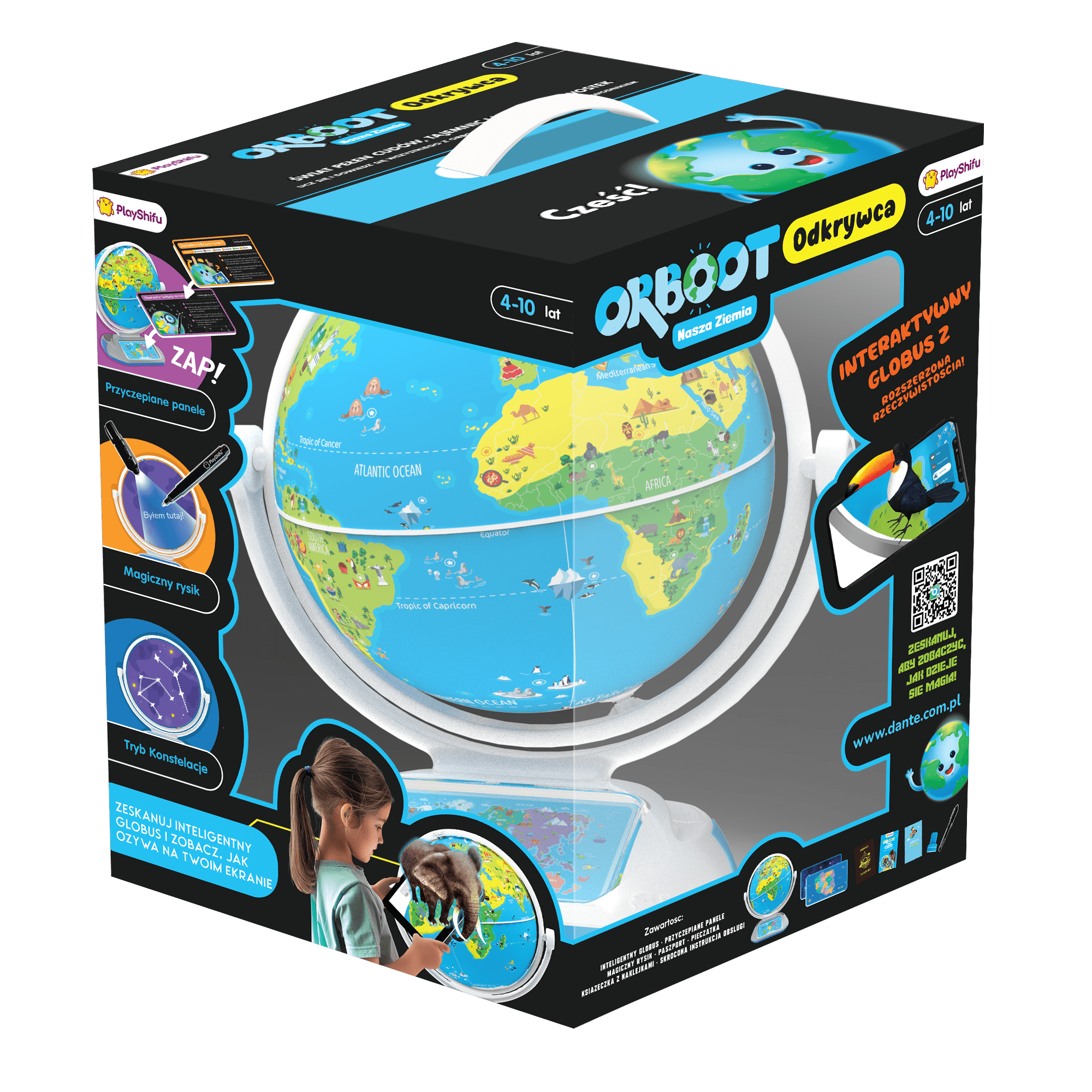 Zestaw zawiera kolorowy globus z obrazkami, książeczkę z naklejkami i paszport, w którym młody odkrywca zapisze listę swoich ulubionych miejsc na świecie. Pobierz aplikację Orboot Earth, zainstaluj na swoim urządzeniu, a następnie ciesz się nauką przez zabawę. Zeskanuj wybrane elementy graficzne na globusie i patrz, jak ożywają na Twoim ekranie!