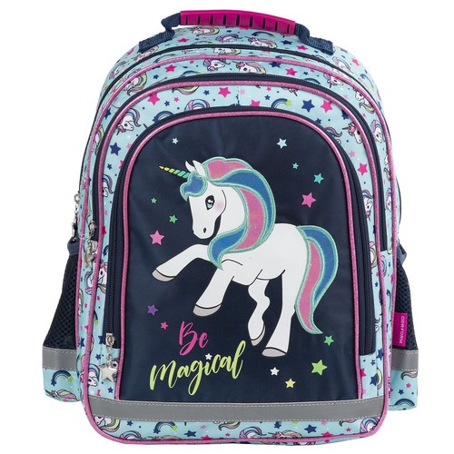 Dwukomorowy plecak szkolny z obszerną kieszenią przednią. Po bokach znajdują się dwie boczne kieszonki wykończone siatką. Plecak posiada miękkie wyściełane szelki, ergonomiczne plecy, taśmy odblaskowe, wzmacnianą rączkę oraz wzmacniane dno.