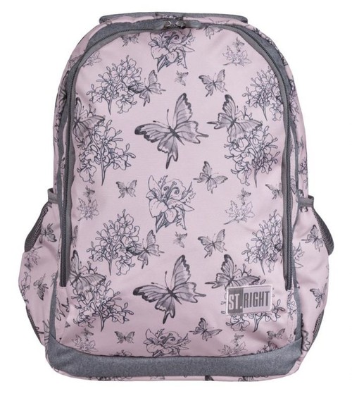 Pojemny i funkcjonalny plecak szkolny przypadnie do gustu każdemu. Plecak charakteryzuje staranne wykonanie oraz piękny wzór w motyle na pastelowym tle. Materiał z którego plecak uszyto jest wodoodporny i wytrzymały. Plecak jest posiada 2 duże komory. W jednej z komór znajduję się duża zakładka na format A4 oraz polarowa kieszeń na smartfona; w drugiej komorze znajduje się organizer na długopisy oraz karabińczyk z brelokiem na klucze. Frontowa komora jest wzmocniona od zewnątrz pianką, chroniąc zawartość przed ewentualnym uszkodzeniem. Po bokach plecak posiada dwie otwarte kieszenie na butelkę wody lub bidon. Wszystkie suwaki zakończone są dużymi poręcznymi pullerami. Tył plecaka jest usztywniony, ergonomiczny i pokryty oddychającym materiałem. Szelki są szerokie, miękko wyściełane pokryte od spodu oddychającym materiałem. Spód plecaka wzmocniony jest grubą pianką. U góry plecak ma wszyty miękko wyściełany, wzmocniony uchwyt do przenoszenia oraz wyjście na słuchawki. W plecaku dodatkowo znajduje się uchwyt do suwaka głównej komory pozwalający na założenie zabezpieczenia kłódkowego lub z szyfrowaniem TSA.