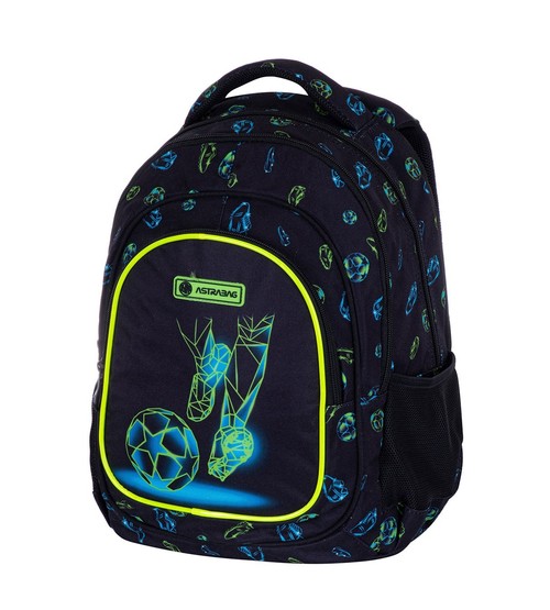Trzykomorowy plecak Astrabag to gratka dla wszystkich fanów piłki nożnej. Pełna dynamiki geometryczna grafika przedstawiająca piłkarza chwilę przed kopnięciem piłki oraz liczne piktogramy przykuwają uwagę każdego miłośnika tej najpopularniejszej dyscypliny sportowej. Plecak wyposażony jest w trzy pojemne komory pełne praktycznych schowków. Zastosowano w nim wyjątkową technologię Ergo Back minimalizującą naciski na barki i kręgosłup oraz zapewniającą poczucie komfortu dziecka.