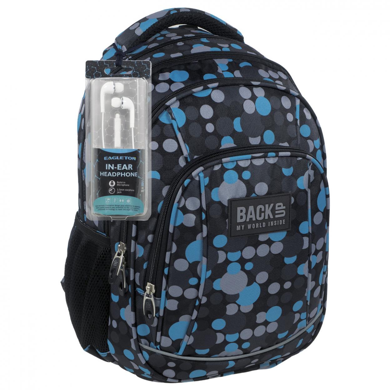 Szkolny plecak BackUP model A w stonowanych kolorach czerni i błękitu wykończony szarością.