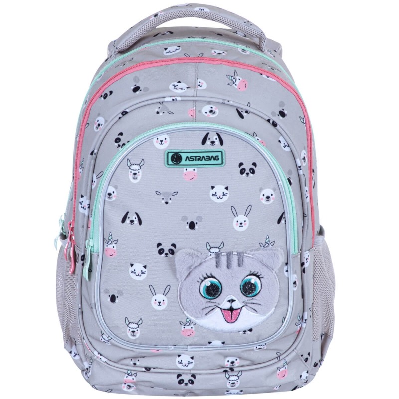 Trzykomorowy plecak Astrabag został stworzony z myślą o wszystkich miłośniczkach kotków. Na jego froncie znajduje się naszyty pluszowy pyszczek mruczka, który jest przemiły w dotyku. Dodatkowo szara kolorystyka przeplatana pastelowymi odcieniami różu i mięty skradnie serce każdej dziewczynki. Plecak wyposażony jest w trzy pojemne komory pełne praktycznych schowków. Zastosowano w nim wyjątkową technologię Ergo Back minimalizującą naciski na barki i kręgosłup oraz zapewniającą poczucie komfortu dziecka.