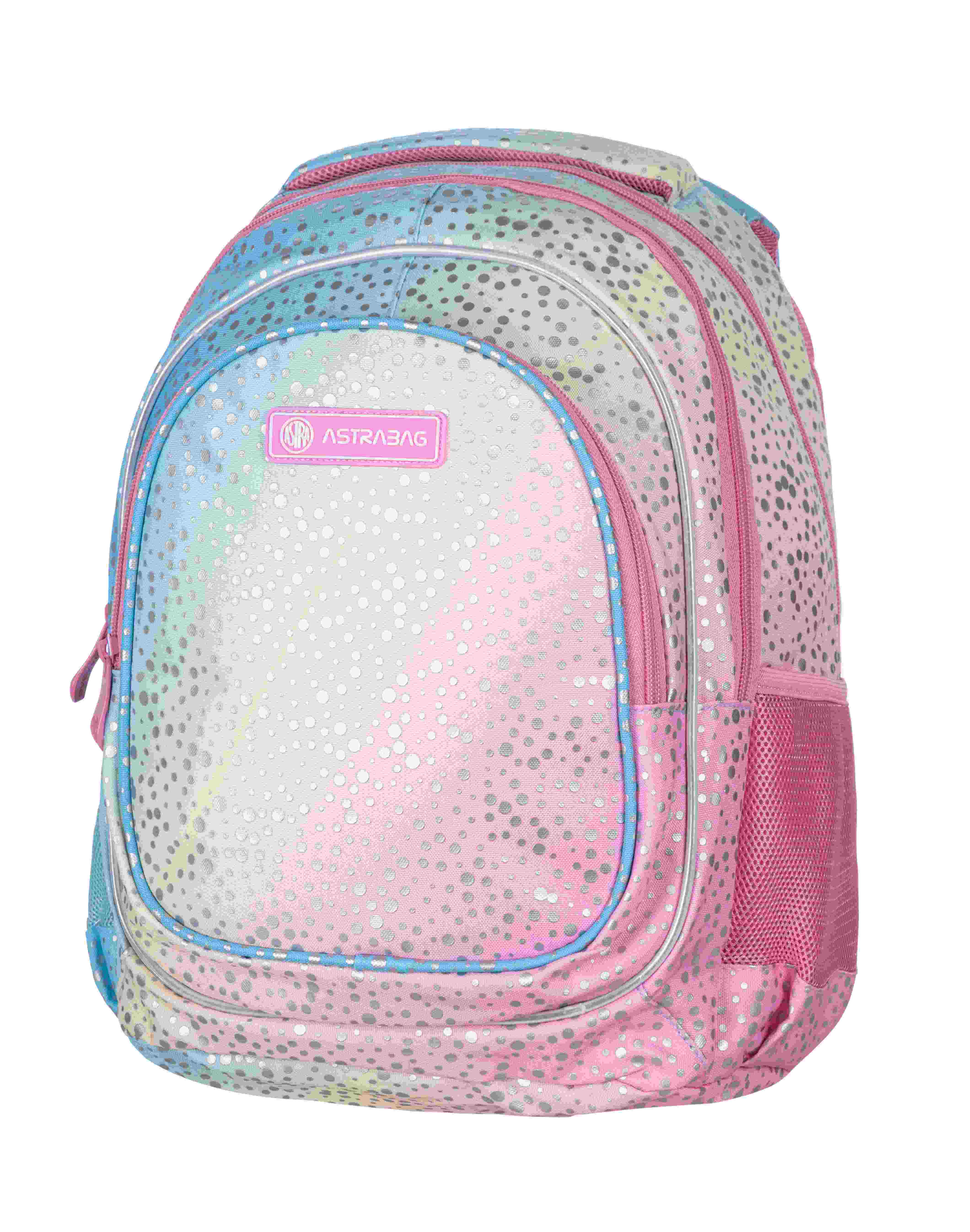 Trzykomorowy plecak szkolny Astrabag z motywem pastelowego ombre to absolutny hit tego sezonu. Piękna kolorystyka wzbogacona o srebrny, mieniący się w słońcu, kropkowany motyw skradnie serce każdej dziewczynki. Plecak Astrabag posiada trzy funkcjonalne komory wyposażone w praktyczną kieszonkę oraz organizer na drobiazgi. Zastosowano w nim najnowszą technologię Ergo Back minimalizującą naciski na barki i kręgosłup oraz zapewniającą poczucie komfortu dziecka.