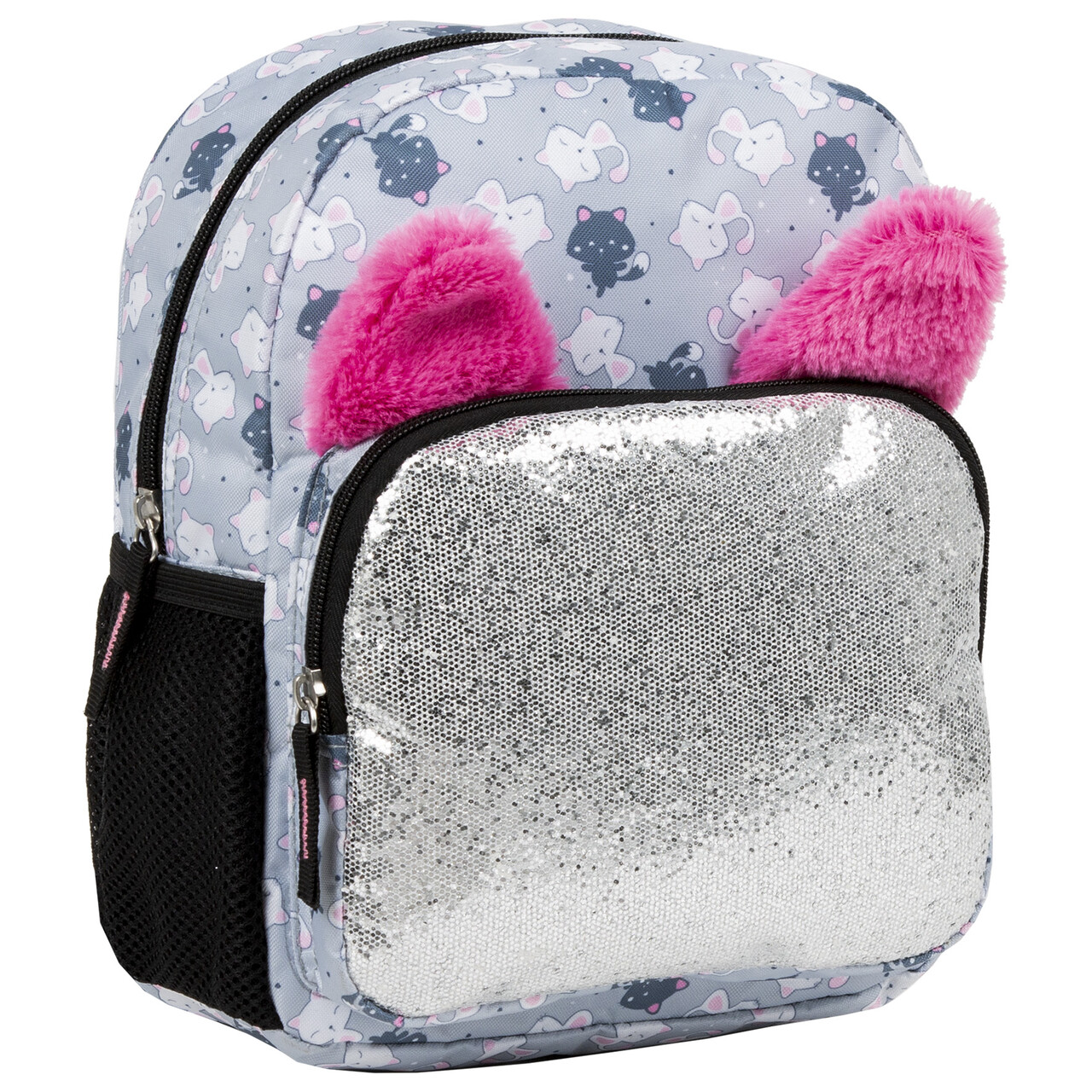 Słodkie kotki pokazują uszka, które dyskretnie wyłaniają się ponad brokatową kieszenią. Ten mały plecaczek ma w sobie duuuży potencjał.