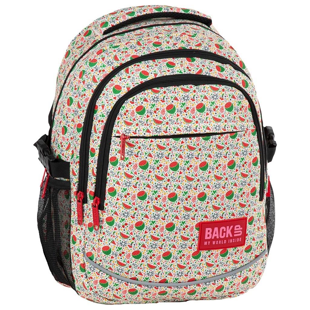 Plecak BackUP model G 60 kremowe tło i czerwone arbuziki zostały ożywione malutkimi wisienkami i truskawkami i wykończone żółtym konfetti. Gumowa naszywka z logo BackUP nadaje plecakowi ciekawego designu.