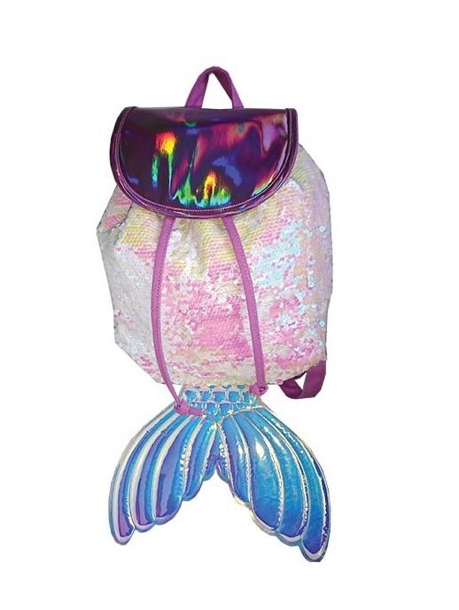 Plecak ma atrakcyjny design w stylu syrenki, z dwustronnymi, mieniącymi się cekinami jasnoróżowymi, od spodu białymi. Idealnie nada się do przedszkola, na basen czy szkolną wycieczkę. Plecak posiada jedną komorę, ściąganą sznurkiem i zamykaną klapą na rzep. Posiada regulowane szelki, oraz uchwyt do zawieszenia. Wysokość plecaka (bez ogona) 30 cm, z ogonem 47 cm.