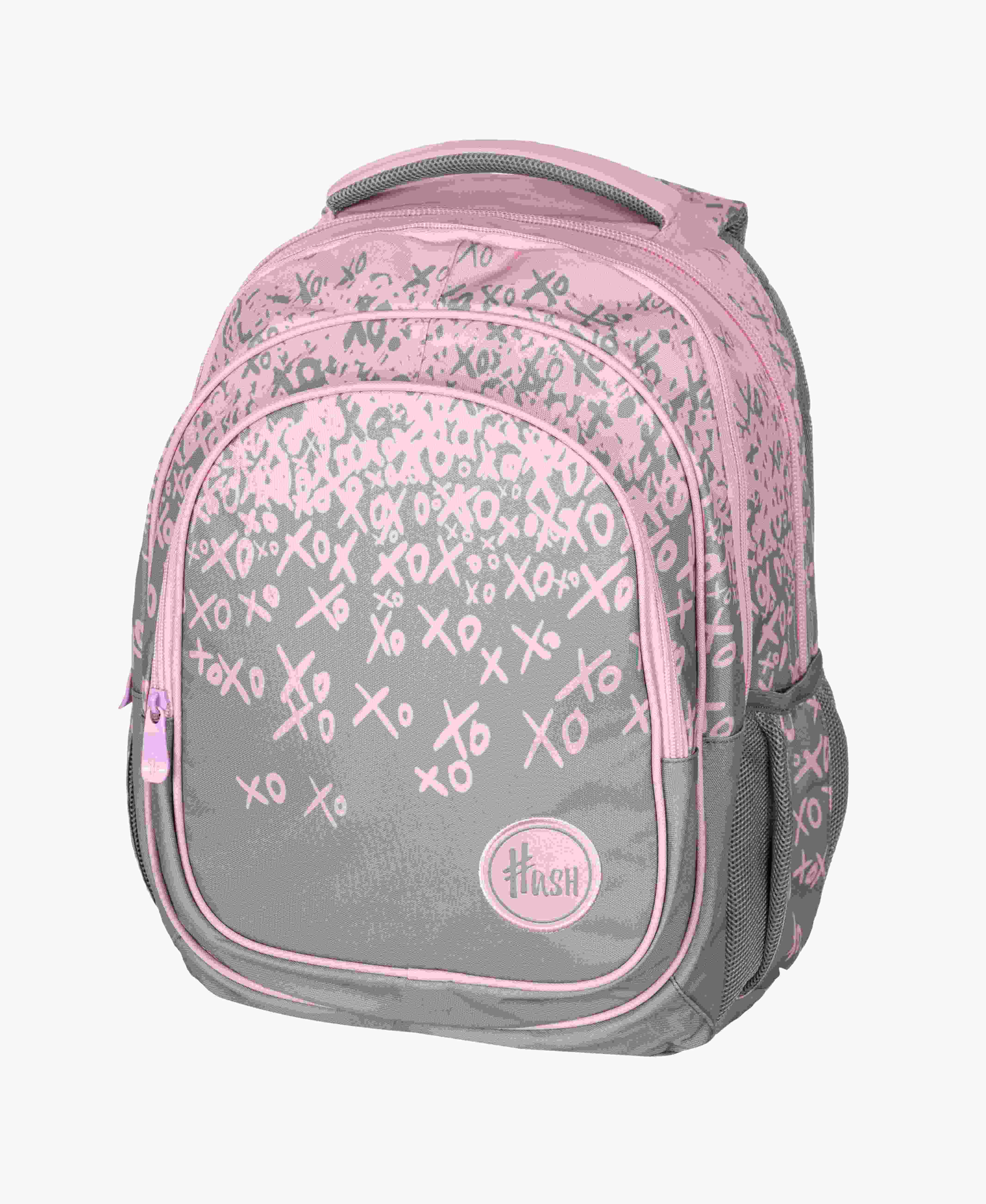 Trzykomorowy plecak Hash w efektownej szaro-różowej kolorystyce z motywem graficznym stworzonym z napisów XOXO. Plecak Hash posiada trzy funkcjonalne komory wyposażone w praktyczną kieszonkę oraz organizer na drobiazgi. Zastosowano w nim najnowszą technologię Ergo Back minimalizującą naciski na barki i kręgosłup oraz zapewniającą poczucie komfortu dziecka.