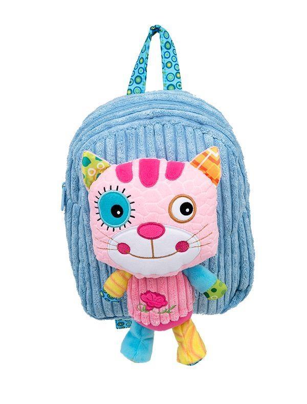 Ten kolorowy pluszak, jak każdy kot, lubi wędrówki, ale nie jest typowym dachowcem, gdyż na wyprawy zabiera ze sobą każdego zucha! Lubi podziwiać okolice z poziomu błękitnego plecaczka, a gdy tylko ma ochotę pobawić się z maluchami, zeskakuje z niego i zmienia się w najprawdziwszą maskotkę. Wszystko za sprawą paseczka na rzep umieszczonego z tyłu jego głowy, który bez trudu można przełożyć przez szlufkę plecaczka. Kotek wykonany jest z materiałów o różnej fakturze, przez co rozwija umiejętności poznawcze malucha. Błękitny plecaczek posiada aż dwie kieszenie: dużą, zapinaną na zamek błyskawiczny i mniejszą schowaną pod pleckami kota. Dzięki regulowane szelkom i wygodnemu uchwytowi koci plecaczek i twój szkrab będą nierozłączni.