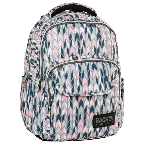 Plecak BackUP model L 11 w niezwykle elegancki, geometryczny wzór w stonowanych, pastelowych odcieniach szarości, bieli i różu.