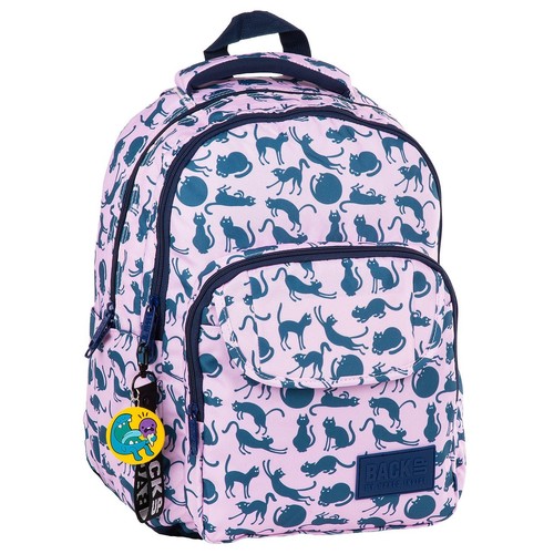 Plecak BackUP model L 18 duże szaro - niebieskie koty w zabawnych pozach przestawiono na różowym jasnym tle w pastelowej tonacji. Gumowa naszywka z logo BackUP nadaje plecakowi ciekawego wyglądu.