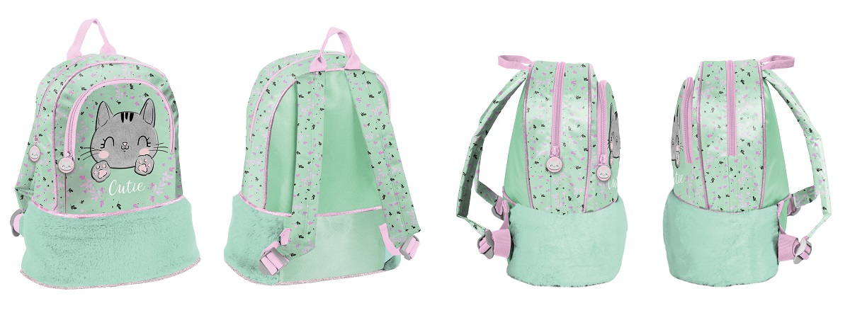 uchwyt do noszenia. Na froncie plecaka brokatowe wstawki i welurowa naszywka z