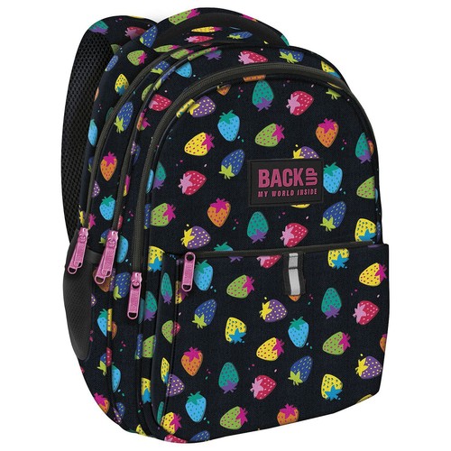 Plecak BackUP model N 05 w wielobarwne, słodkie truskawki na czarnym tle. Plecak dla tych, którzy nie boją się słodyczy, bo używają jej jako dodatku.