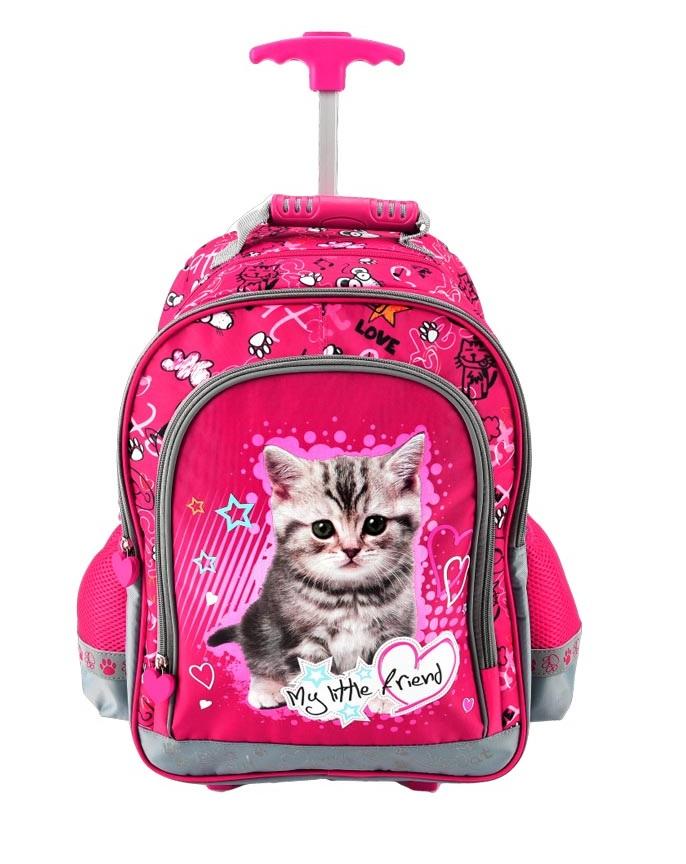 Bardzo funkcjonalny plecak szkolny. Posiada stelaż z kółkami, dzięki któremu plecak staje się mobilny i użytkownik ma w pełni odciążone plecy. Plecak wyposażony jest w wysuwaną rączkę z dwustopniową regulacją wysokości, lekki stelaż oraz szerokie, ergonomiczne szelki o regulowanej długości. Posiada praktyczny rzep do podpinania szelek chroniący je przed zabrudzeniem w czasie toczenia. Dodatkową ochronę zapewnia pokrowiec na kółka zabezpieczający odzież przed zabrudzeniem w momencie założenia plecaka na plecy. Liczne elementy odblaskowe nie tylko pomagają zachować bezpieczeństwo zarówno w nocy jak i podczas złych warunków atmosferycznych, ale stanowią również dekorację plecaka. Funkcjonalność użytkowania gwarantują 2 pojemne komory, wewnętrzne przegródki i 3 kieszenie zewnętrzne, które pomagają dobrze rozlokować zawartość i utrzymać porządek w plecaku. Boczne elastyczne kieszonki stanowią idealne miejsce na bidon czy butelkę z napojem.