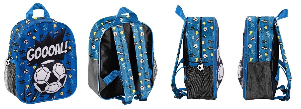 Mały plecak przedszkolny 3D, jedna komora, jedna boczna kieszeń z siatki (mieści małą butelkę, bidon lub termos). Regulowane szelki, wygodny uchwyt do przenoszenia.