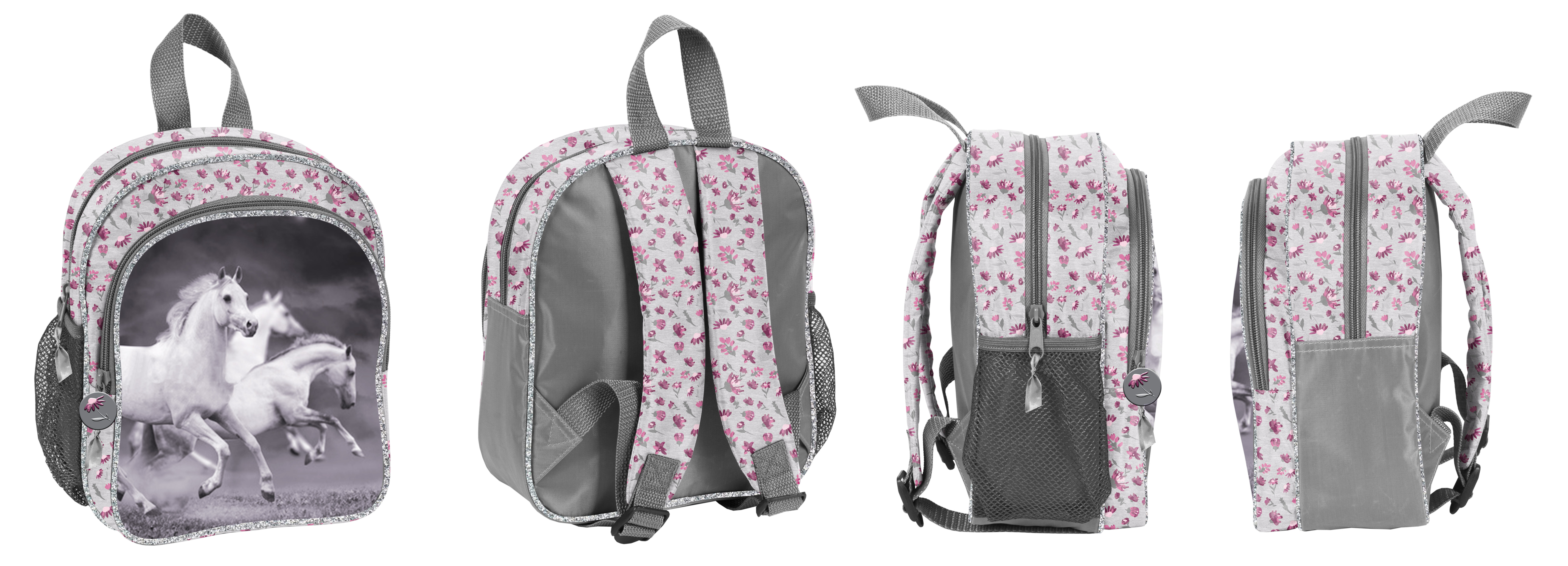 Plecak przedszkolny. Jedna główna komora, jedna kieszeń na froncie, dwie boczne kieszenie z siatki - mieszczą małą butelkę, bidon lub termos. Wygodny uchwyt do przenoszenia. Regulowane szelki z materiału. Ozdobne wstążki przy pullerach ułatwiające rozpinanie.