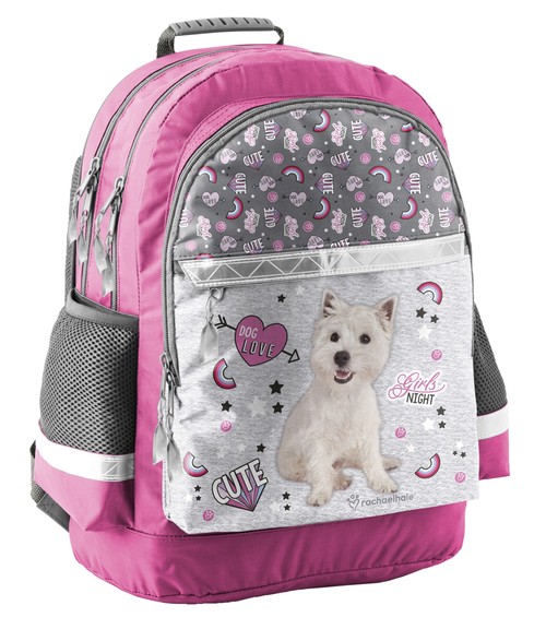 Plecak posiada dwie komory, dwie kieszenie na froncie, boczne kieszenie z siatki, usztywniane, ergonomiczne plecy pokryte siatką, profilowane szelki pokryte siatką, usztywniane dno oraz odblaskowe elementy.
