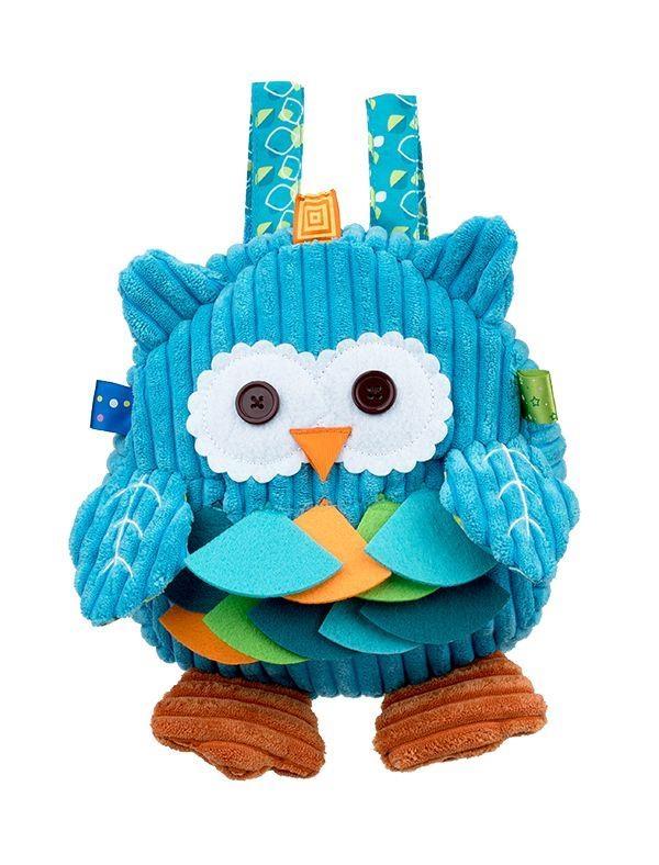 Sztruksowa sówka jest wesołym kompanem spacerków. W swych piórkach kryje rozpinaną kieszeń, zdolną pomieścić niewielką zabawkę lub drugie śniadanie potrzebne na każdej ekscytującej wyprawie. Brzuszek sówki zdobią filcowe piórka a odstające skrzydełka i nóżki raźnie podskakują w rytmie marszu malucha. Dzięki materiałowym metkom o różnej fakturze ten sztruksowy przytulak zabawi szkraba i zachęci go do poznawania świata, a wygodne, regulowane szelki pozwolą mu towarzyszyć maluchowi przez długi czas.