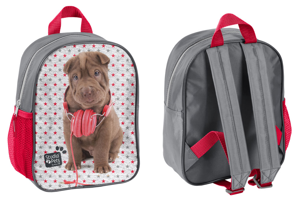 Mały plecak przedszkolny, jedna komora, jedna boczna kieszeń z siatki (mieści małą butelkę, bidon lub termos). Regulowane szelki, wygodny uchwyt do przenoszenia.