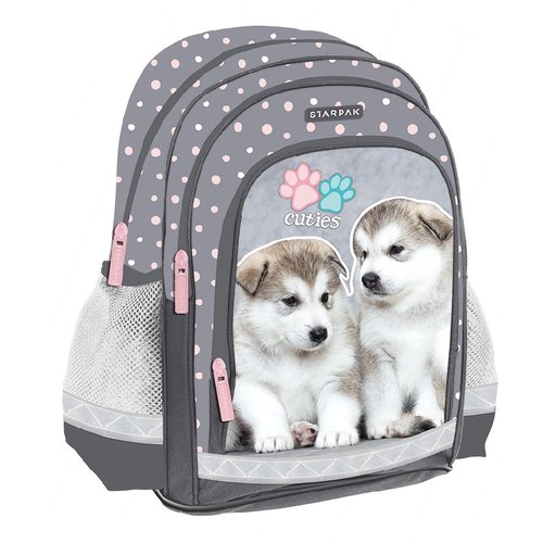 Wygodny i funkcjonalny plecak szkolny Starpak z młodzieżową grafiką z pieskami Haskimi. Użytkowanie takiego plecaka to czysta przyjemność. Zapoznaj się również z innymi produktami Starpak dedykowanymi młodzieży! Plecak szkolny składa się z dwóch komór zapinanych na zamek, co pozwoli na lepsze zorganizowanie wewnętrznej przestrzeni. Na zewnątrz znajduje się bardzo obszerna przednia, zapinana kieszeń, po bokach dwie kieszenie ze ściągaczem na umieszczenie w nich bidonu z napojem. Plecy i szelki wyściełane gąbką zapewniają komfort użytkowania i równomierne rozłożenie obciążenia na plecach dziecka. Wykonany z trwałego materiału wykończonego elementami odblaskowymi dla większego bezpieczeństwa. Plecak jest wyrobem tekstylnym. Przeznaczony dla dzieci w wieku: 3+. Wymiary produktu (wys.x szer. x gł.) [cm] 39x29x19,5.