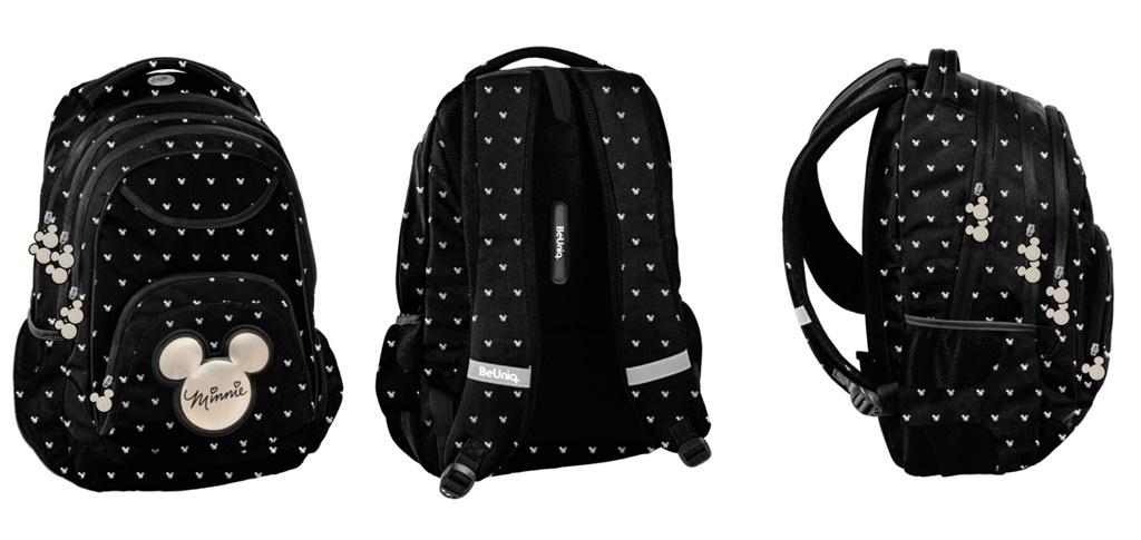 Plecak szkolny Minnie Bl;ack. Posiada trzy pojemne komory, kieszeń przednią z organizerem zamykaną na zamek oraz dwie boczne kieszonki wykonane z siatki, które pomieszczą butelkę, bidon czy termos. W komorze głównej znajduje się przegroda (na laptop), w drugiej komorze organizer z kieszenią na zamek oraz uchwyt na klucze. Wzmocnione profilowane plecy oraz miękkie, regulowane szelki sprawiają, że plecak nosi się niezwykle komfortowo. Plecak posiada wygodny uchwyt do przenoszenia, uszko do powieszenia oraz elementy odblaskowe dla zwiększenia bezpieczeństwa na drodze lub po zmroku. Ze względu na swój rozmiar, plecak to idealne rozwiązanie zarówno dla nastolatków, jak i dla młodszych dzieci. W Paso sięgamy po nowoczesne wzornictwo, nie zapominając o tym, by oferować solidne i praktyczne produkty.