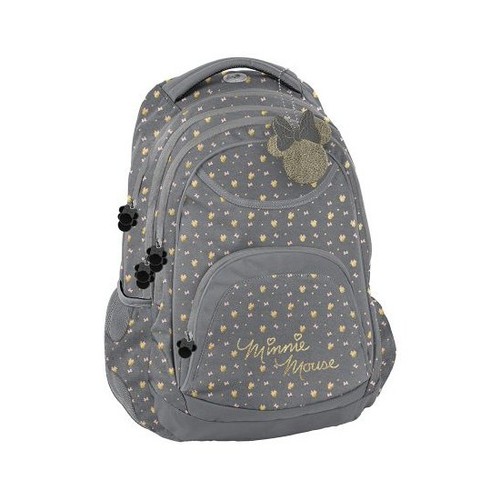 Plecak szkolny Minnie Gold. Posiada trzy pojemne komory, kieszeń przednią z organizerem zamykaną na zamek oraz dwie boczne kieszonki wykonane z siatki, które pomieszczą butelkę, bidon czy termos. W komorze głównej znajduje się przegroda (na laptop), w drugiej komorze organizer z kieszenią na zamek oraz uchwyt na klucze. Wzmocnione profilowane plecy oraz miękkie, regulowane szelki sprawiają, że plecak nosi się niezwykle komfortowo. Plecak posiada wygodny uchwyt do przenoszenia, uszko do powieszenia oraz elementy odblaskowe dla zwiększenia bezpieczeństwa na drodze lub po zmroku. Ze względu na swój rozmiar, plecak to idealne rozwiązanie zarówno dla nastolatków, jak i dla młodszych dzieci. W Paso sięgamy po nowoczesne wzornictwo, nie zapominając o tym, by oferować solidne i praktyczne produkty.