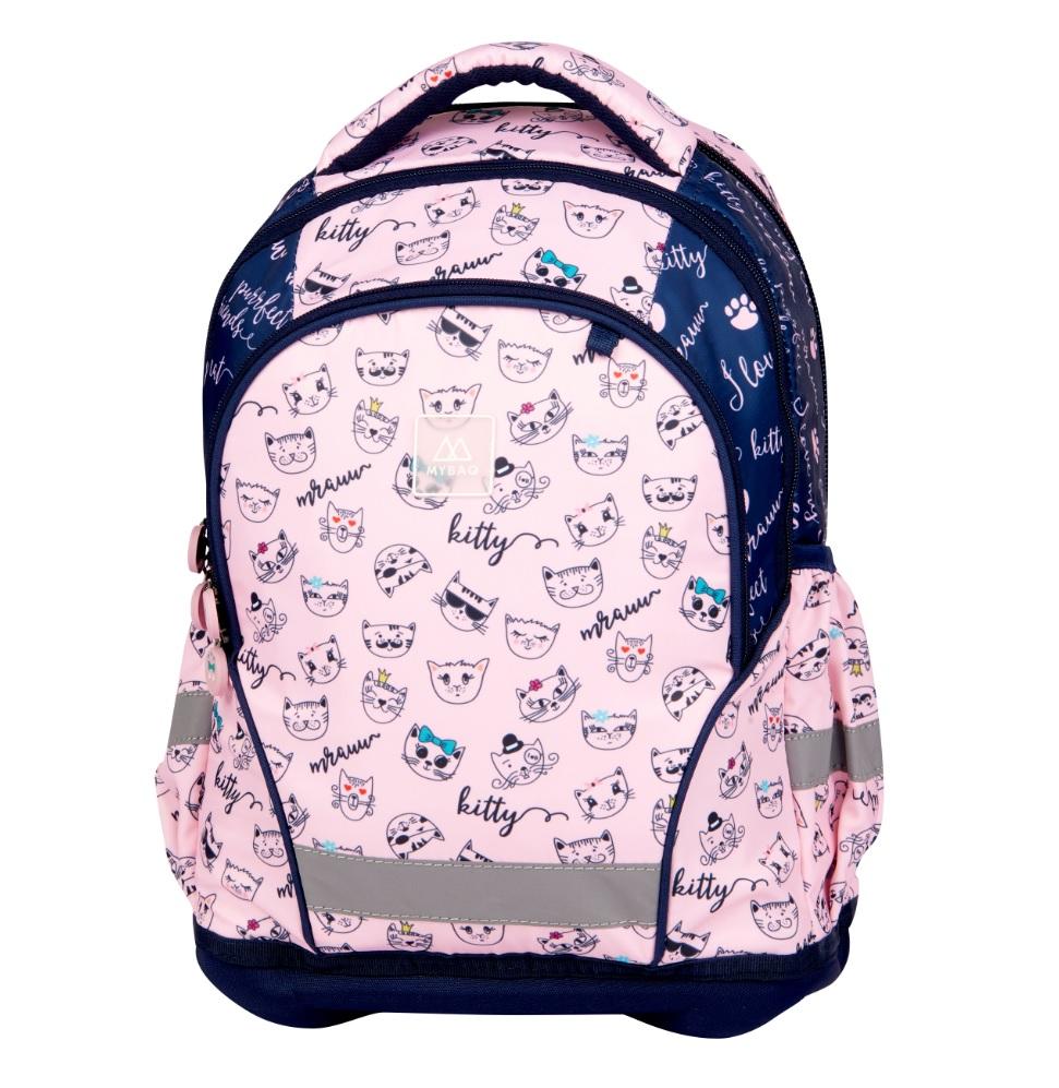 Mocny satynowy poliester 240 D z wodoodporną powłoką chroniącą zawartość tornistra przed zamoczeniem podczas deszczu we wzorze KITTY, oraz poliester 600D - materiał odporny na ścieranie oraz rozdarcia - w pozostałych wzorach