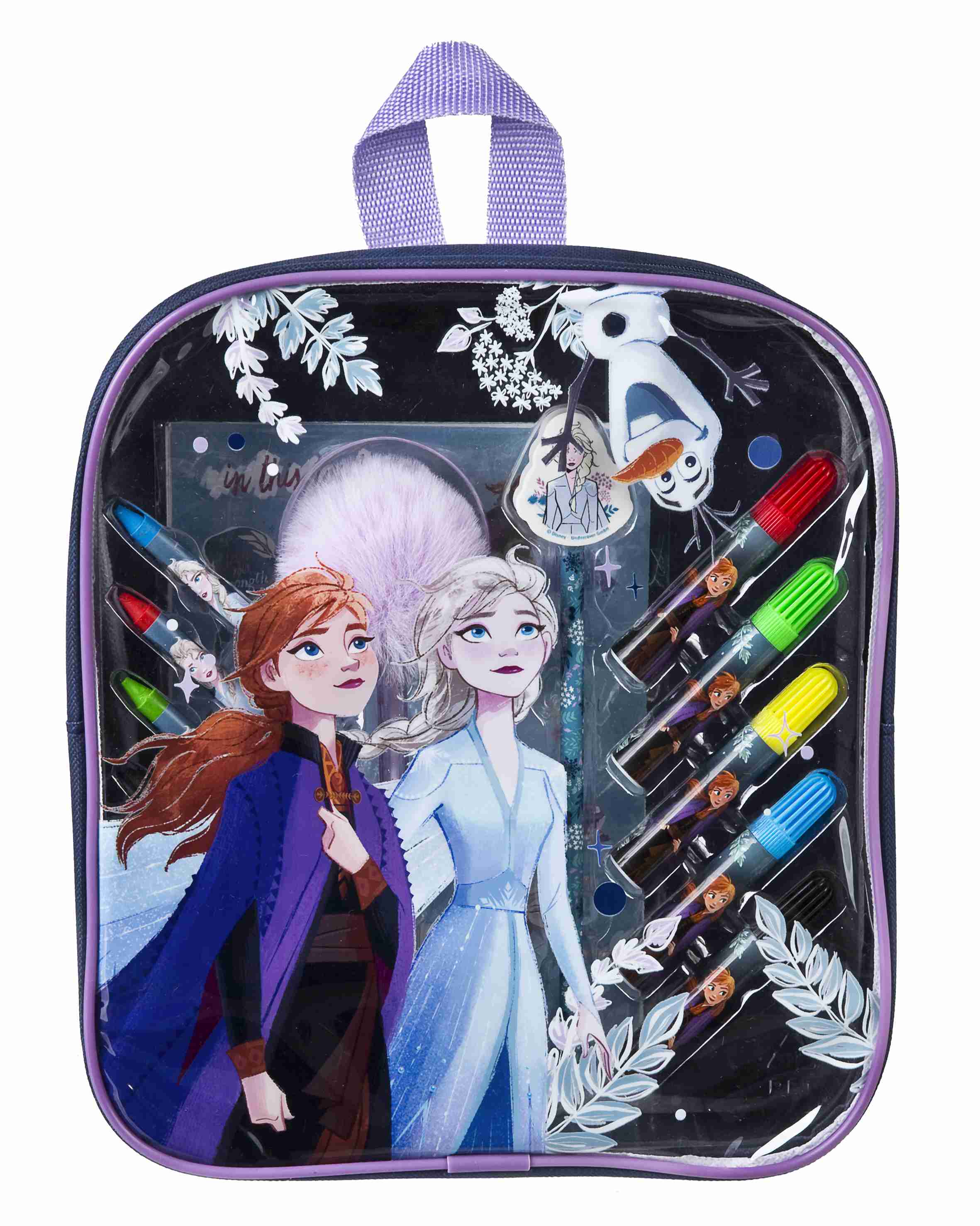 Zestaw do kolorowania Kraina Lodu w plecaku z przezroczystym przodem. Zawartość: 1 ołówek z efektem folii i gumką, 1 brokatowy długopis żelowy z nakładką na pompon, 5 markerów, 5 kredek, 1 papierowy arkusz naklejek A5, 4 plakaty A5, 4 białe kartki, sklejone ze sobą na szczycie.
