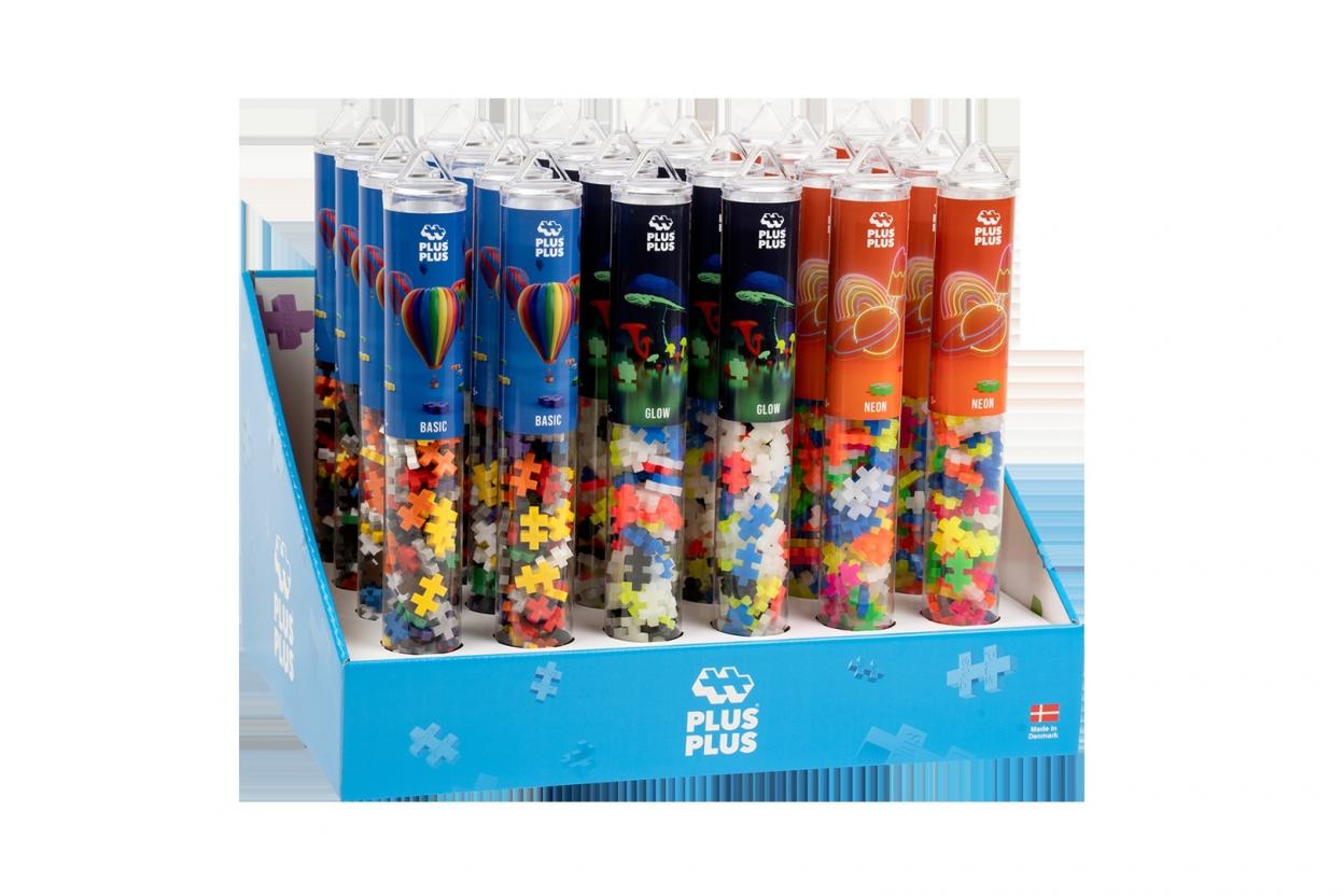 Display Plus-Plus, który świetnie nadaje się do ekspozycji w sklepie.. Każda tuba zawiera 100 elementów.