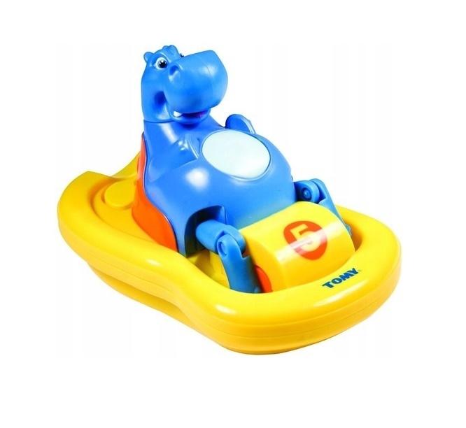 Hipopotam pływa na rowerze wodnym, śpiewa i robi bąbelki z piany.