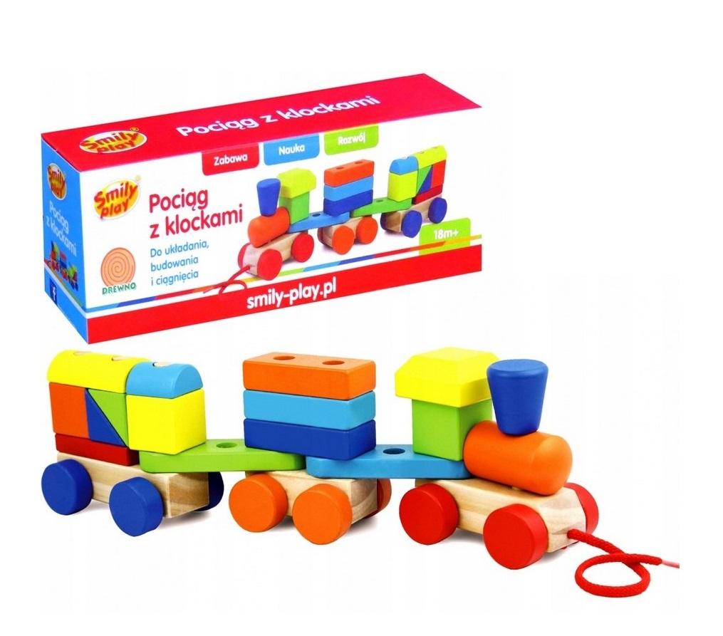Pociąg z Klockami to drewniana zabawka, która rozwija sprawność małych rączek, koordynację wzrokowo-ruchową i wyobraźnię przestrzenną.
