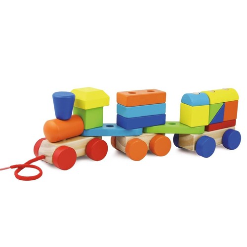 To zabawka do układania, budowania i ciągnięcia. Uczy rozpoznawania kształtów i kolorów. Zestaw składa się z 19 elementów o różnorodnych kształtach, w tym z lokomotywy i dwóch wagoników. Wagony można dowolnie łączyć, układając na nich poszczególne elementy.