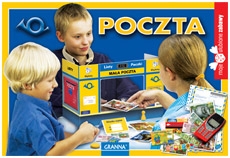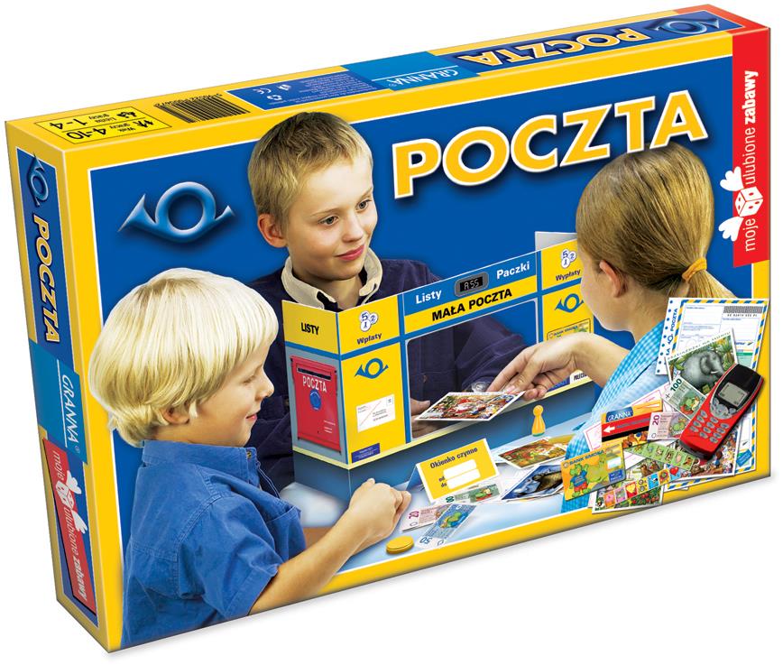 Okienko z tabliczką, pieniądze i druczki, i kartki pocztowe, i paczki.
