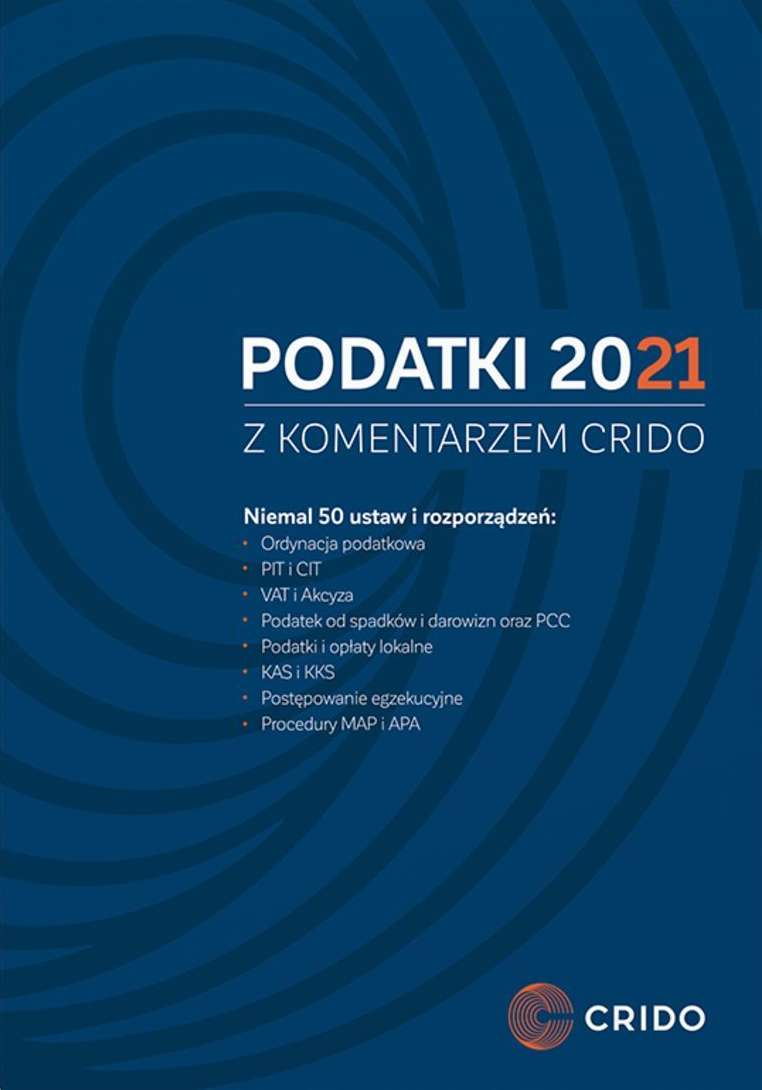 Podatki 2021 z komentarzem Crido to pierwszy na rynku, wydawany już od 2015 roku, kompleksowy zbiór aktualnych przepisów podatkowych z komentarzem do wybranych ustaw oraz praktycznymi opracowaniami przygotowanymi przez praktyków z wieloletnim doświadczeniem – doradców podatkowych z Crido(Link do innej strony).
