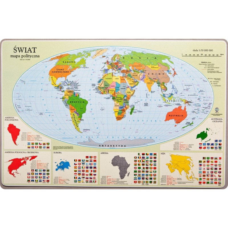 Nadruk z aktualnym podziałem politycznym Świata, na mapie znajdują się wydzielone kontynenty z przynależnymi państwami, flagi i stolice państw, powierzchnia w km², oraz najważniejsze informacje dotyczące danego kontynentu. Podkładka jest zabezpieczona wysokiej jakości folią z podkładem antypoślizgowym, odporna na ścieranie, kurz, wodę, wilgoć.