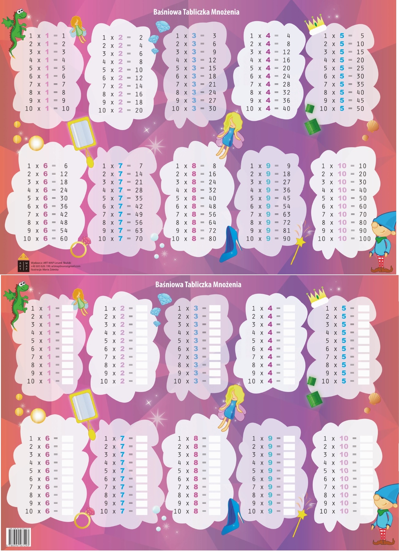 Plansza edukacyjna - tabliczka mnożenia - baśniowa. Plansza może służyć jako podkładka na biurko. Na jednej stronie tabliczka mnożenia z wynikami. Na drugiej działania mnożenia 1-10 z pozostawionym pustym miejscem na wpisanie wyniku. To doskonały pomysł na ćwiczenie mnożenia. Na tablicy można pisać pisakiem suchościeralnym. Plansza foliowana dwustronnie.