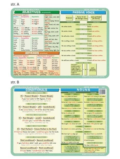 Dwustronna podkładka edukacyjna - prezentujezagadnienia z zakresu: conditionals, nouns, adjectives, passive voice. Format 40 x 30 cm. Usztywniona, ale jednocześnie elastyczna, dwustronnie foliowana. Wchodzi w skład zestawu 60 podkładek edukacyjnych zawierających kilkaset tematów pomocnych w utrwalaniu wiedzy, rozwijaniu zainteresowań, w nauce oraz zabawie.