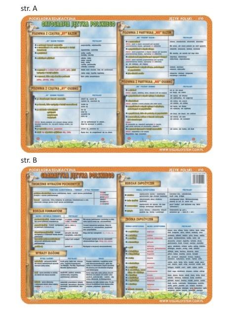 Laminowana i elastyczna podkładka na biurko , praktyczna pomoc w nauce, o wymiarach 40x30x cm, Pisownia z '-by' i 'nie', tworzenie wyrazów pochodnych, rodzaje zapożyczeń