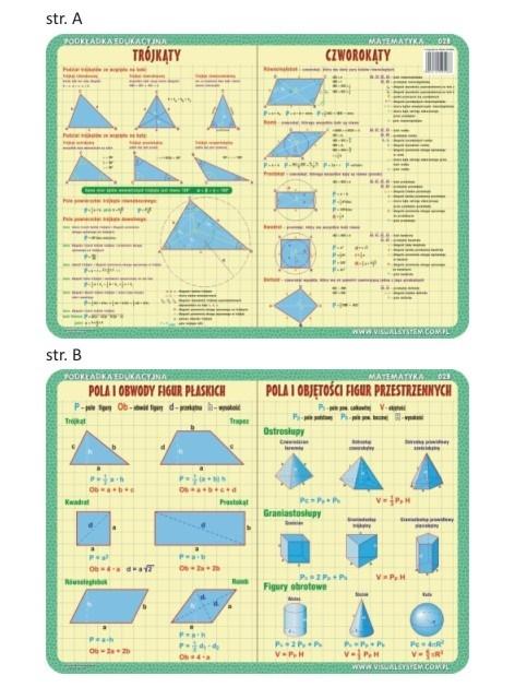 Dwustronna podkładka edukacyjna - prezentuje zagadnienia z zakresu: pola i obwody figur płaskich, pola i objętości figur przestrzennych, trójkąty, czworokąty. Format 40 x 30 cm. Usztywniona, ale jednocześnie elastyczna, dwustronnie foliowana. Wchodzi w skład zestawu 60 podkładek edukacyjnych zawierających kilkaset tematów pomocnych w utrwalaniu wiedzy, rozwijaniu zainteresowań, w nauce oraz zabawie.
