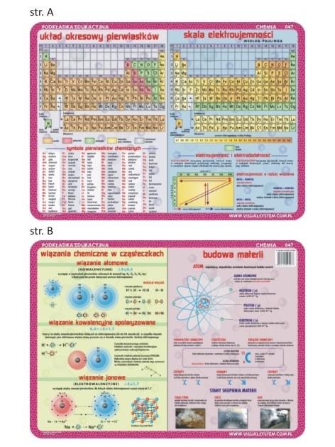 Laminowana i elastyczna podkładka na biurko, praktyczna pomoc w nauce, o wymiarach 40x30 cm, Układ okresowy pierwiastków, skala elektroujemności, budowa materii, wiązania chemiczne