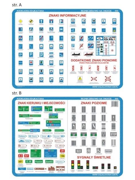 Dwustronna podkładka edukacyjna - prezentuje znaki drogowe w zakresie: kierunku i miejscowości, poziome, sygnały świetlne, informacyjne. Format 40 x 30 cm. Usztywniona, ale jednocześnie elastyczna, dwustronnie foliowana. Wchodzi w skład zestawu 60 podkładek edukacyjnych zawierających kilkaset tematów pomocnych w utrwalaniu wiedzy, rozwijaniu zainteresowań, w nauce oraz zabawie.