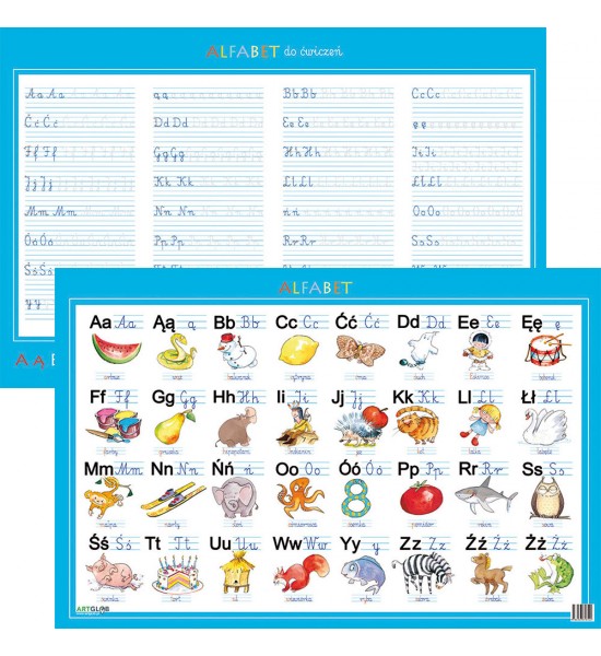 Jedna strona w kolorowy i zachęcający sposób przedstawia poszczególne litery alfabetu. Rewers podkładki to „wielorazowa” ćwiczeniówka, na której wielokrotnie można trenować swoją kaligrafię przy użyciu mazaków suchościeralnych.